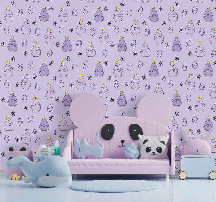 Le papier peint chambre enfant conception de modèle de poussin est graphiquement adorable, avec un motif mettant en vedette des poulets, des œufs, des poussins et des fleurs mauves. Parfait pour une décoration mignonne et joyeuse!
