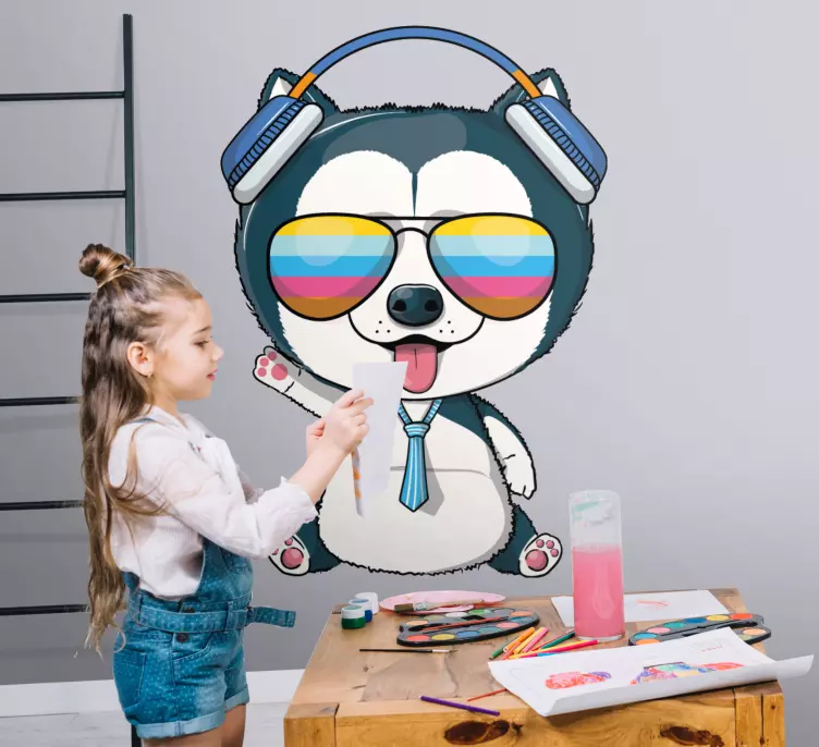 Découvrez notre Autocollant animal de compagnie personnage sympa ! Ce design ludique met en scène un adorable chien espiègle avec des lunettes de soleil et des écouteurs, le tout dans un style décalé et coloré. Un véritable décalcomanie qui apportera une touche amusante à votre décoration, parfait pour égayer vos murs avec une note de drôlerie et de musicalité !