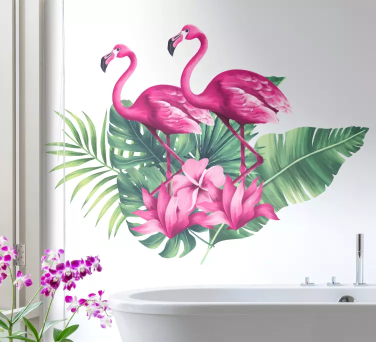 Sticker d'Oiseau Flamants roses avec des feuilles de plantes