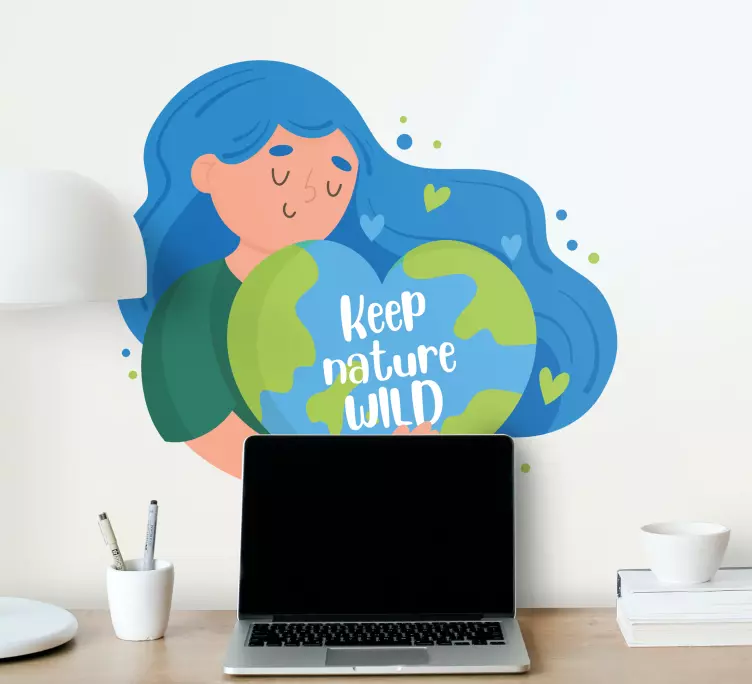 Référence: A48040Une représentation soulignant l'importance de prendre soin de notre planète, encadrée par un personnage tenant tendrement un globe en forme de cœur. La phrase encourage un engagement à préserver les aspects sauvages de la nature, mettant en avant l'amour et la connexion avec la terre.