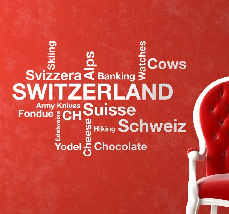 Sticker mural représentant différents mots en anglais qui sont souvent associés à la Suisse, comme par exemple le chocolat, les Alpes, le ski, la fondue, les vâches...