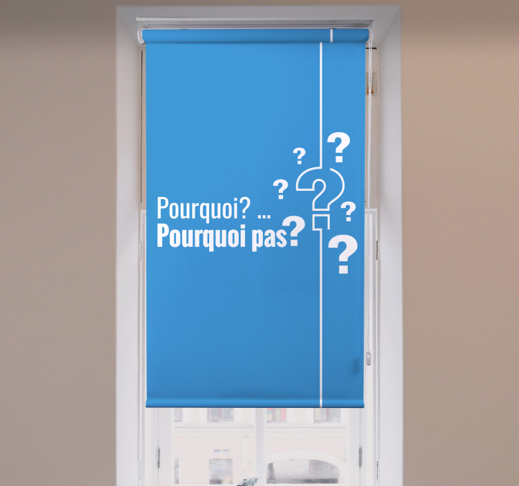 Découvrez notre Store enrouleur phrase pourquoi pas?, une pièce unique qui allie design moderne et inspiration. Avec un motif captivant intégrant des mots tels que motivation, inspirant et curiosité, ce store est bien plus qu'un simple accessoire. Il appelle à la réflexion et à l'interrogation, apportant une touche de bleu apaisant à votre intérieur, tout en suscitant la question Pourquoi pas? Laissez-vous séduire par une décoration qui stimule votre imagination et réinvente l'espace qui vous entoure!