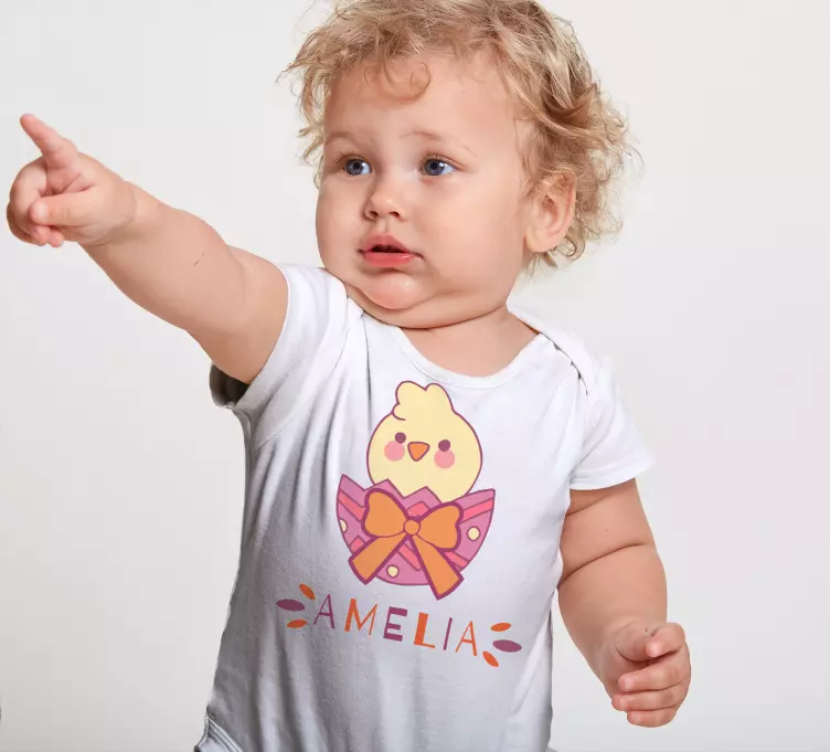 Le T-shirt bébé adorable poussin avec nœud est un véritable petit bijou de douceur et de fantaisie ! Avec son adorable illustration d'un poussin espiègle, ce T-shirt se distingue par son ruban délicat qui ajoute une touche de charme. Ce bébé oiseau tout mignon, entouré d'éléments colorés comme un oeuf et des motifs d'animaux, invite à la personnalisation. Vous pourrez même y ajouter un Nom pour le rendre unique ! Offrez à votre petit un vêtement qui allie style et confort !