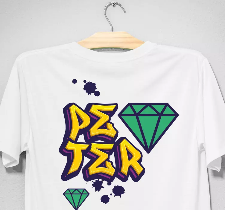 Référence: T5428Ce design dynamique met en avant le nom 'Peter' en lettres stylisées et audacieuses, accompagné d'un graphique en forme de diamant vert. Les éléments ludiques comprennent des éclaboussures colorées, renforçant l'ambiance contemporaine. Parfait pour un style décontracté, il allie une créativité unique à une touche personnelle.