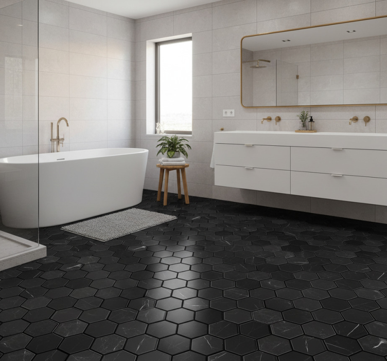 Référence: R23595Apportez une touche d'élégance à votre salle de bain avec notre Tapis vinyle salle de bain hexagone noir. Son design moderne et stylé, qui se distingue par son motif hexagonal audacieux, ajoute une note raffinée à votre espace. Ce tapis est conçu pour transformer votre salle de bain en un lieu accueillant et contemporain, tout en offrant une sensation de confort sous vos pieds.
